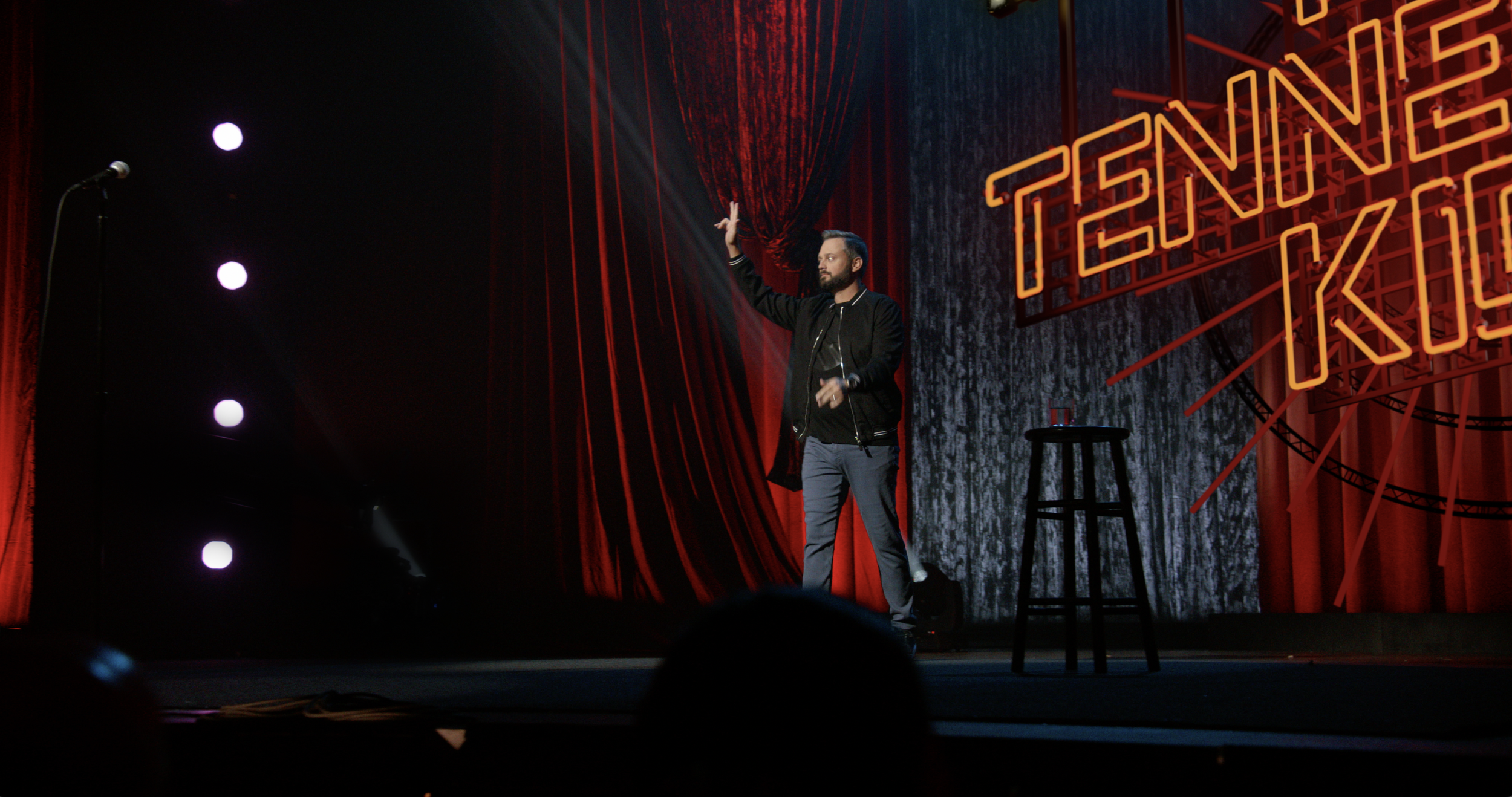 For the opening to The Tennessee Kid, the show title was built as a large virtual 3D neon sign that was tracked onto the stage. The sign was integrated into the opening by having Nate rotoscoped in front of the sign on multiple shots as he makes his entrance.